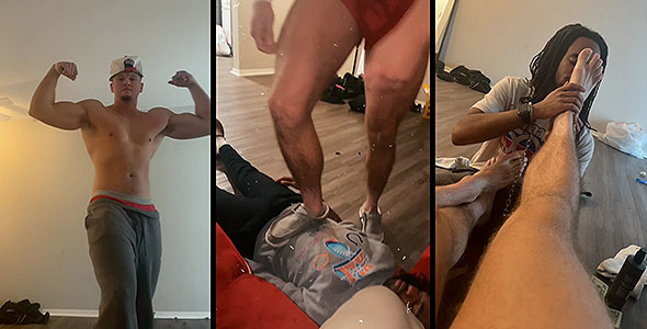 The Beast tramples and chokes his slave during their real time meet. The pathetic cashfag is gagged and ordered to service his master’s feet. The Beast even bullies the slave and gives him a wedgie.