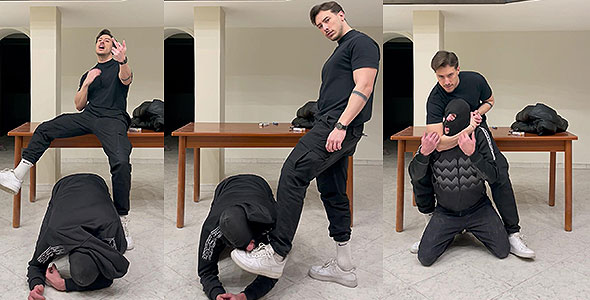 Stefan Master showcases his physical prowess to a kneeling slave, flexing his muscles in between brutally choking his slave. The difference between these two individuals is highly evident with the master standing strong and powerful while the slave grovels and submits on all fours. The masked slave is left humiliated and grateful for the honor of being strangled by their master.