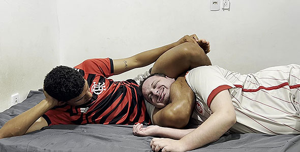Slave Matt craves more of Master Robe and this time serves his sweaty feet. Slave Matt gags on this dom’s heels and entire foot while showing his devotion. Master Robe then decides to squeeze Slave Matt’s throat with a brutal leglock. Slave Matt tries to resist but Master Robe quickly gets the upper hand and puts Slave Matt in his place.