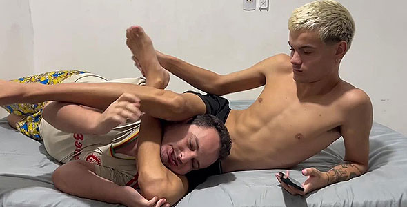Master J gets rougher with Slave Matt when he wraps his arms and legs around the slave for a vicious sleeperhold. Slave Matt turns red and quickly taps out begging for this dom to let up. Master J then gets Slave Matt on his back to gag him with his foot. Slave Matt takes as much of this dom’s foot in his mouth as he can. Slave Matt continues to serve at Master J’s feet by licking and gagging on them some more. Master J looks on in amusement as Slave Matt shows what a devoted footfag he can be to a superior.