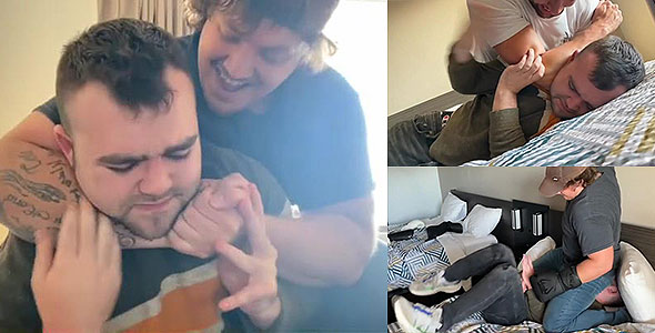 MasterUltimateGod and his dom buddy took their faggot and gave him a bully beatdown. Both of these doms put him through the ringer with a variety of MMA and grappling moves. The weak slave experiences pain and humiliation as the doms laugh in his face while choking him.